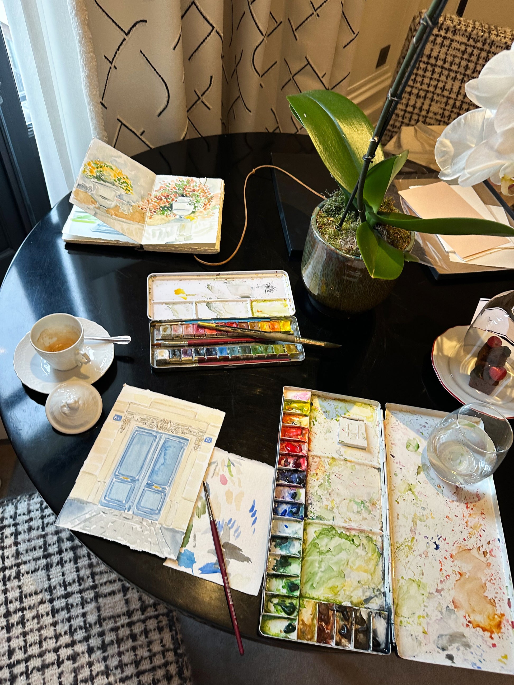 Last fall, I noticed a familiar door about a block or so away from my hotel - the entrance to Julia Child's apartment on the rue de l'Université. I had stumbled upon it a few years before when we stayed at apartment nearby and painted it then. It seemed like fate had brought me back. So I decided to revisit it, painting away in my room at the JK Place. This watercolor is particularly special as it's the only painting in this collection completed in situ in Paris, rather than being inspired by sketches that returned home with me.