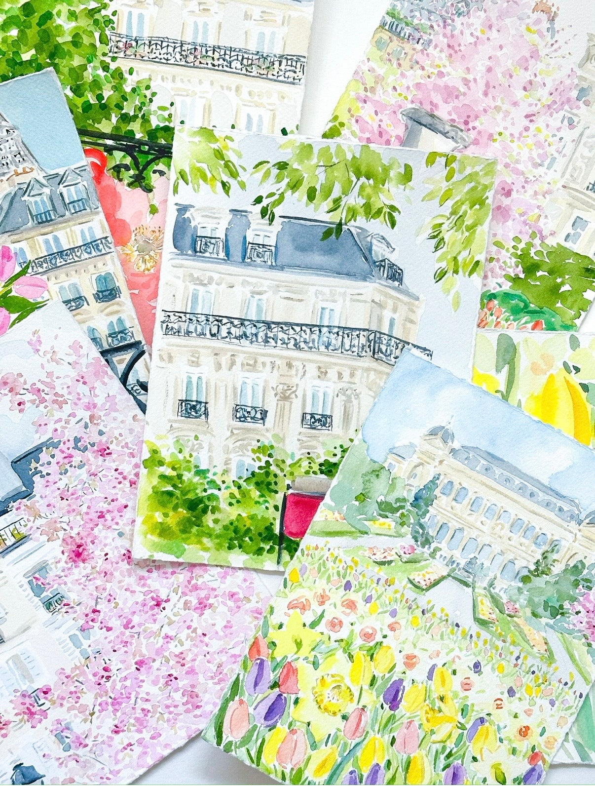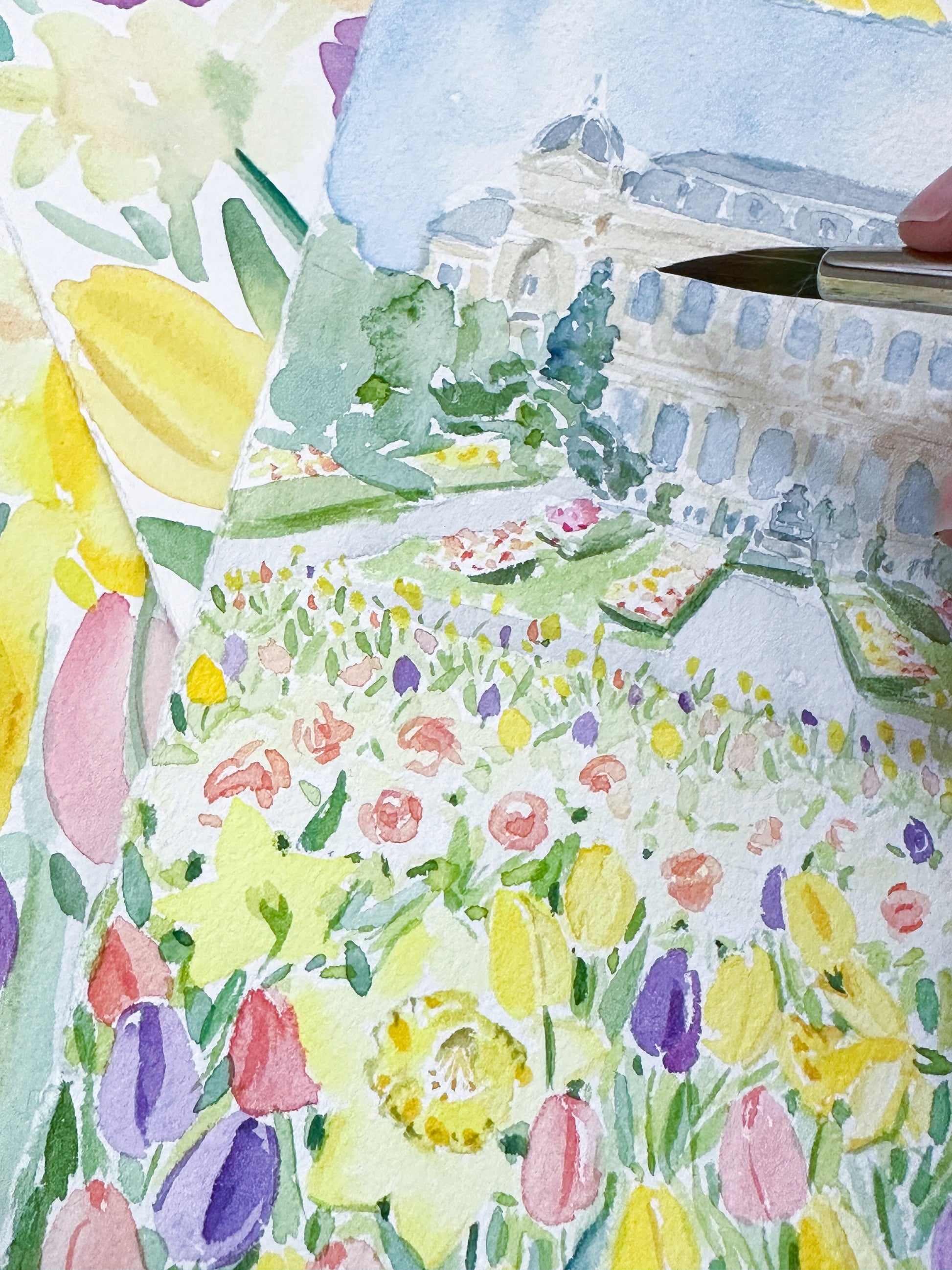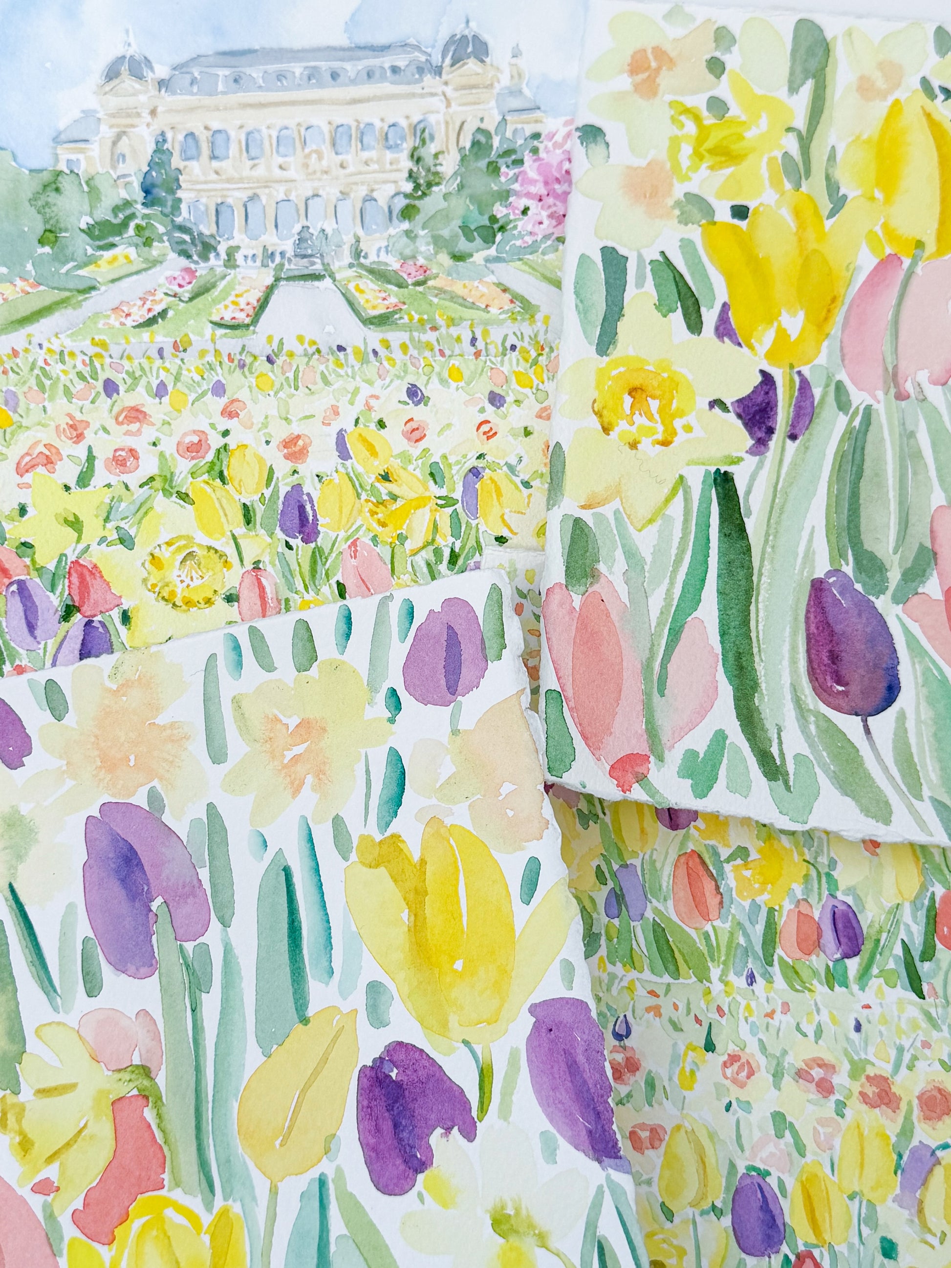 If you're awake early in Paris on an April morning, might I suggest that you start your day with a visit to the Jardin des Plantes just as they open? You'll be rewarded with tulips and daffodils that outnumber people instead of fighting the usual crowds. If you're lucky, the magnificent giant Kwanzan cherry tree will be at its peak, and the light will be perfect. A moment of magic and beauty to remember, and it was sketches and photos from a just such a morning that inspired this watercolor.